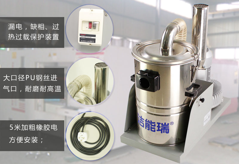 6、机器桶身采用高强度纯不锈钢制作, 坚固耐用,40毫米吸尘口,物料收集桶