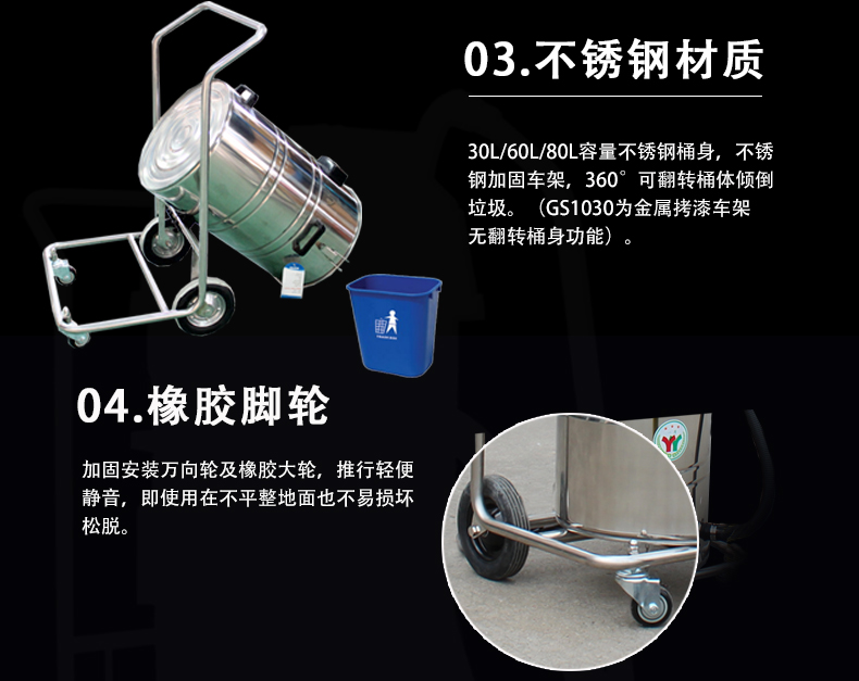 3、大容量60L垃圾桶体可以承载更多的垃圾或污水,并且桶体可以翻转,使倾倒垃圾或污水时很方便。