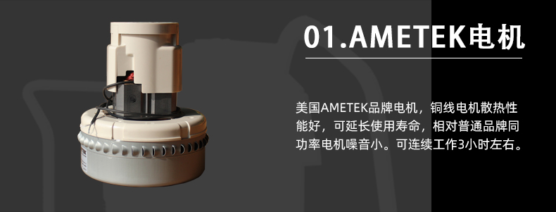 1、3000W工业吸尘器配备强劲静音型电机(美国阿美德格AMETEK专业电机)。吸力大,功效强。其使用寿命是普通商用吸尘器电机的三倍以上。